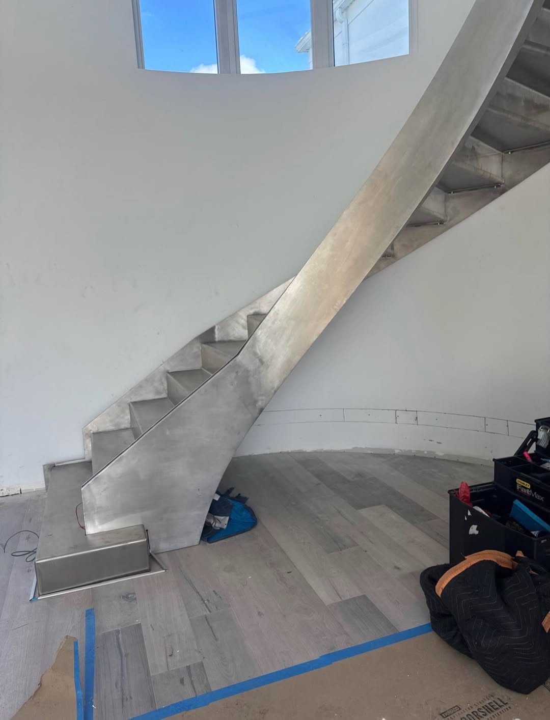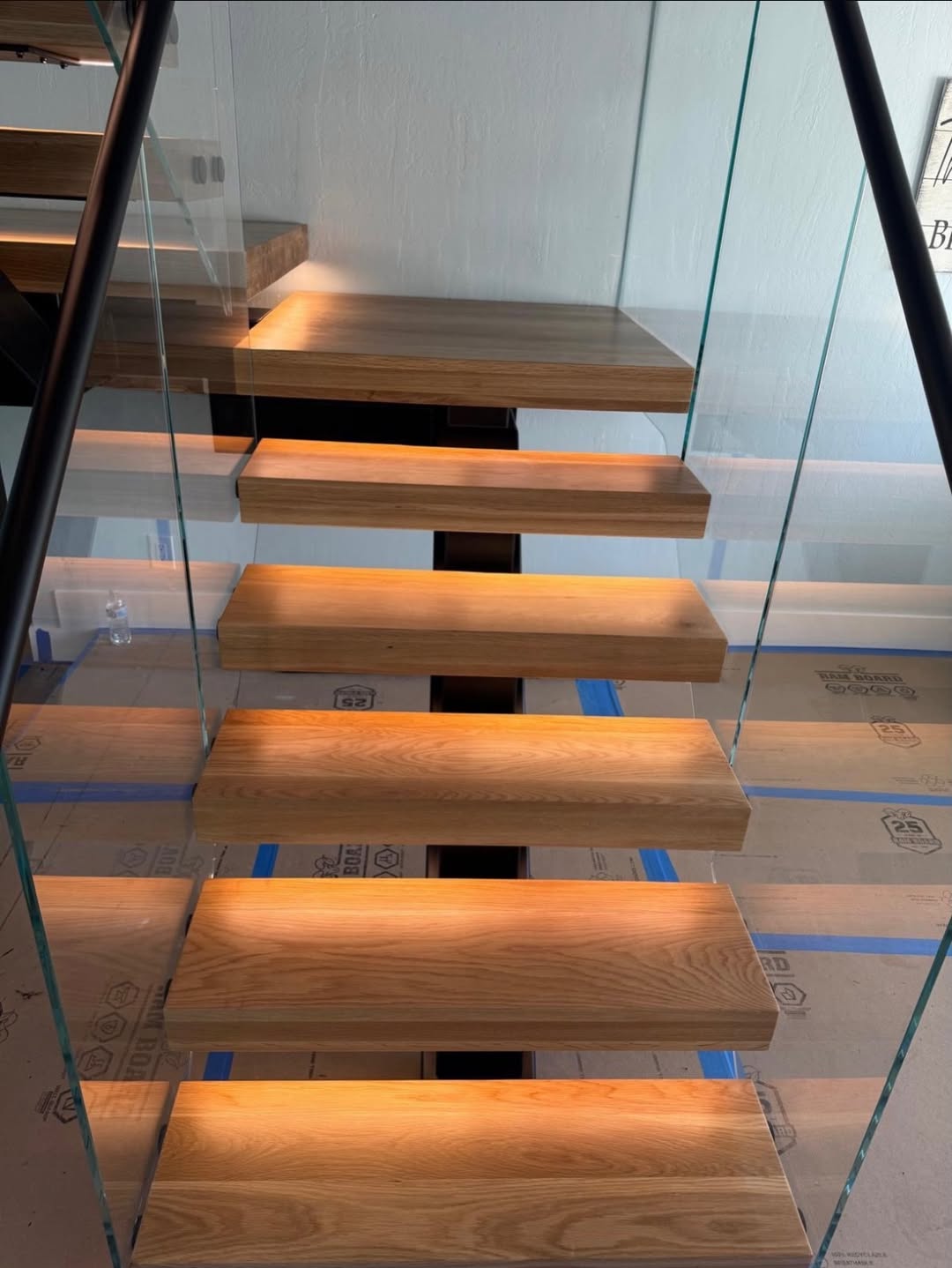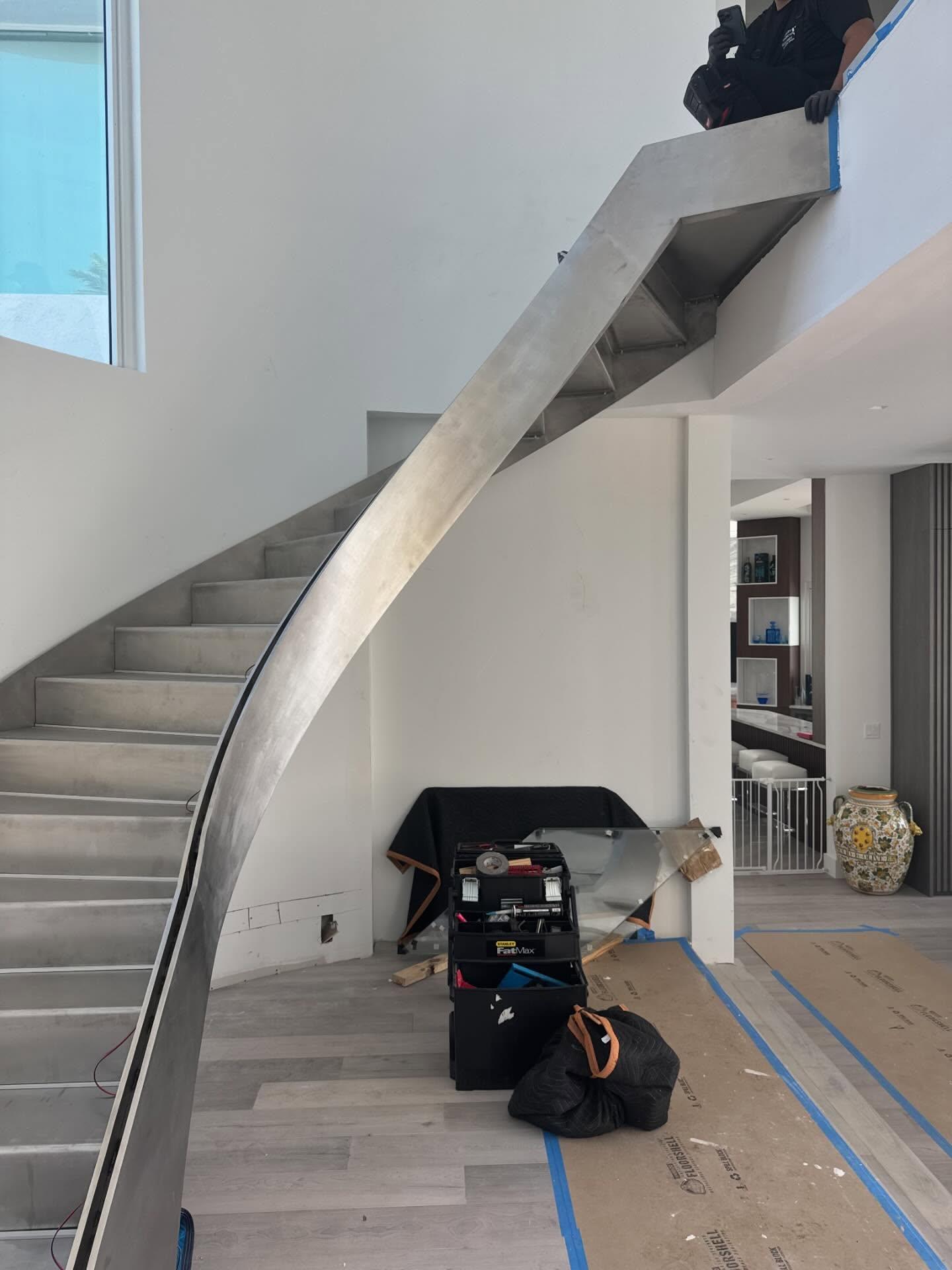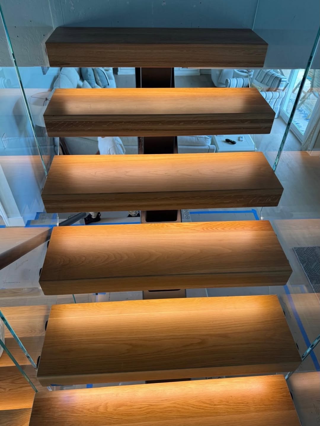 · There is a single central steel beam running along the middle of the staircase.