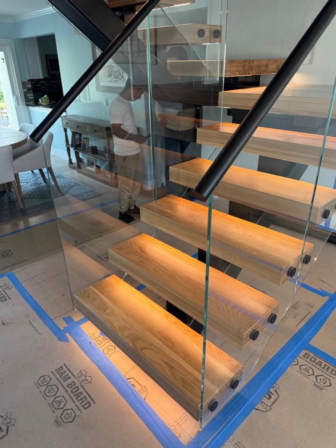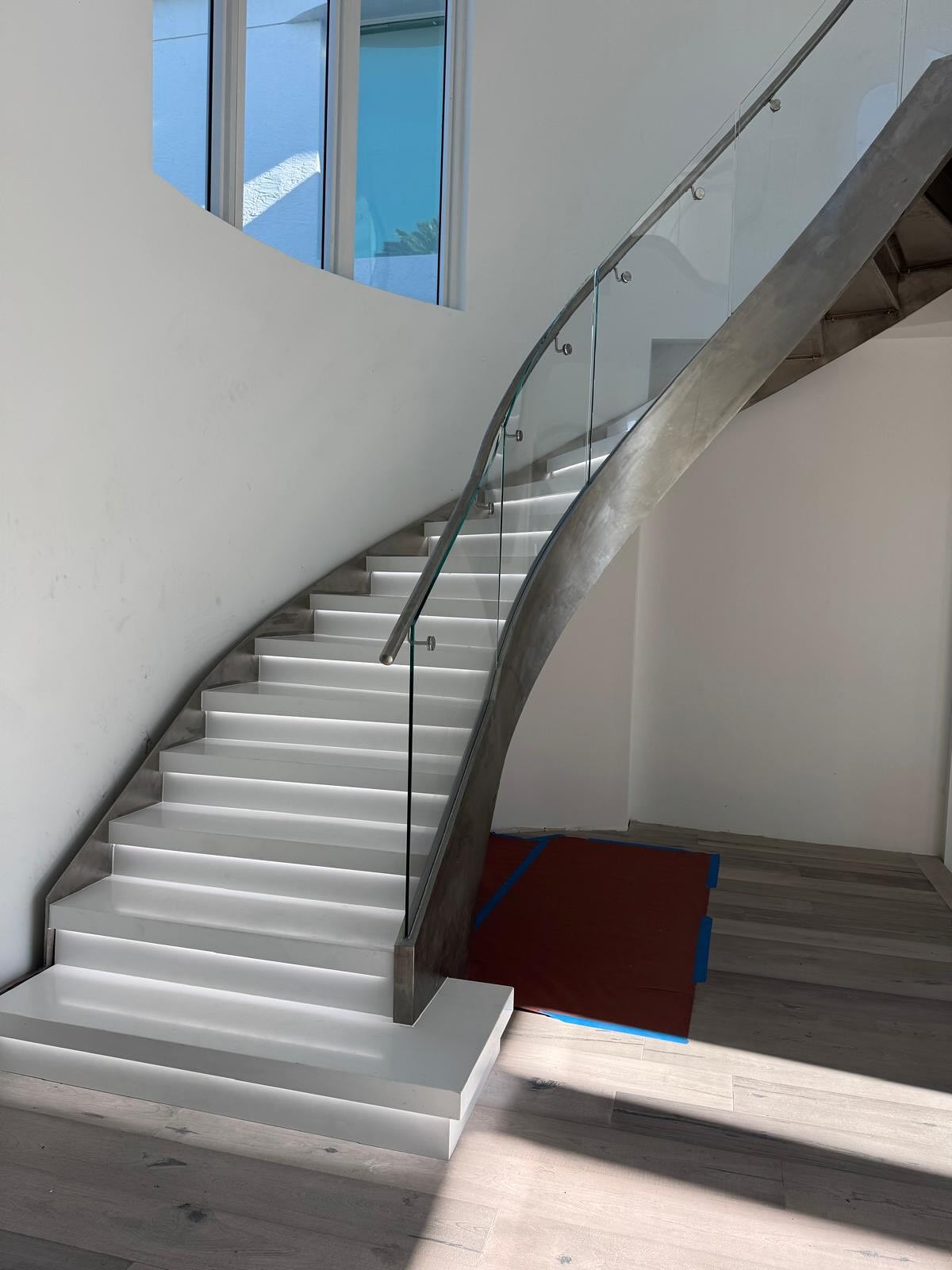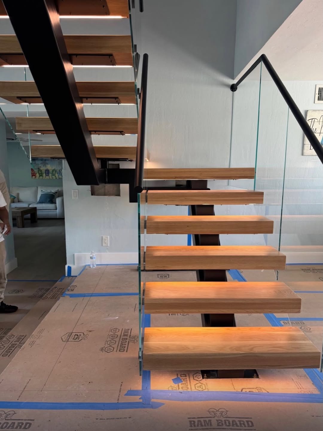 · There is a single central steel beam running along the middle of the staircase.