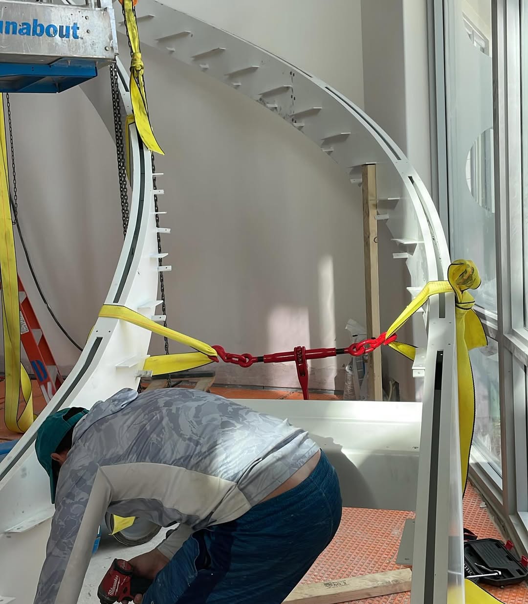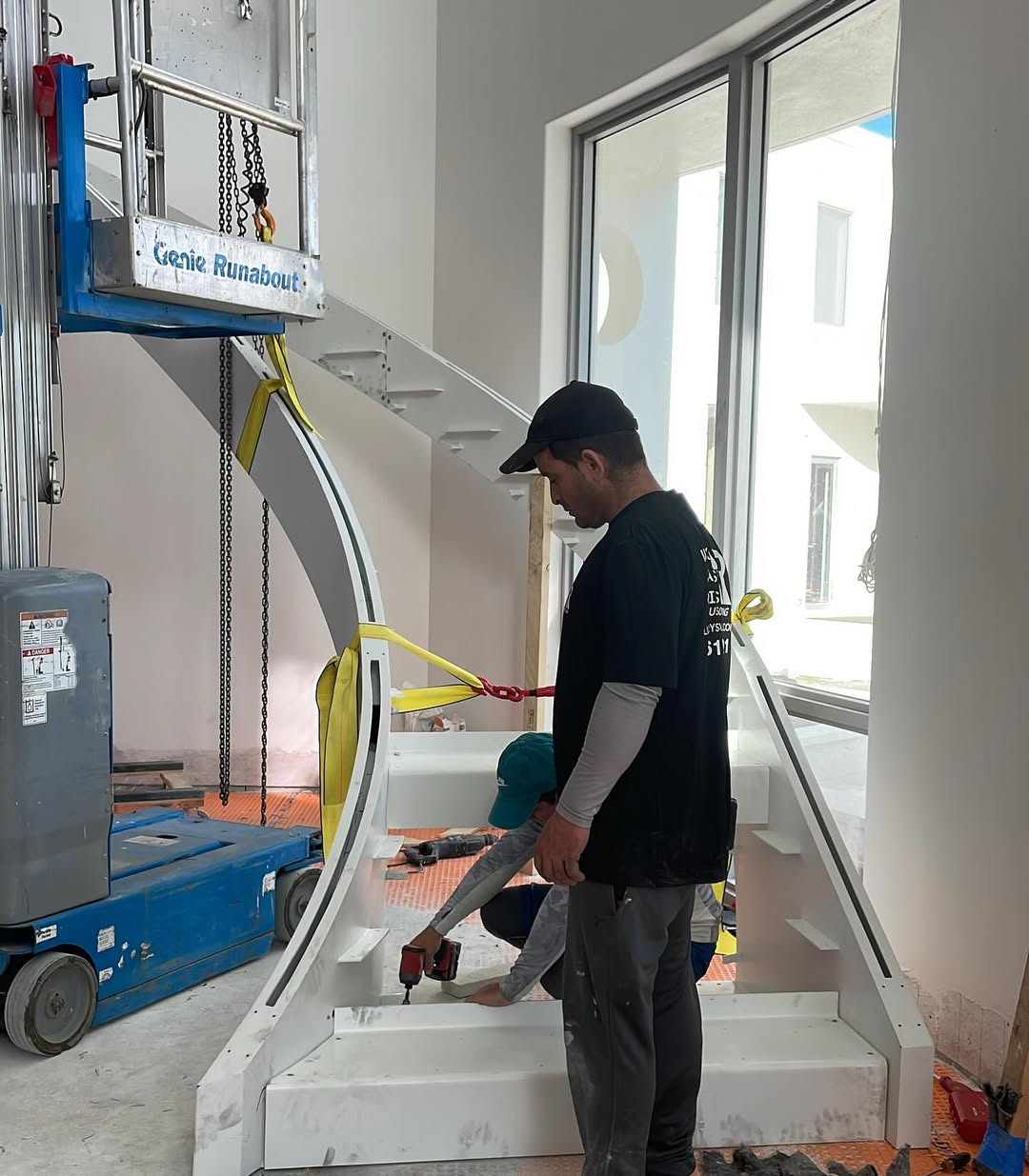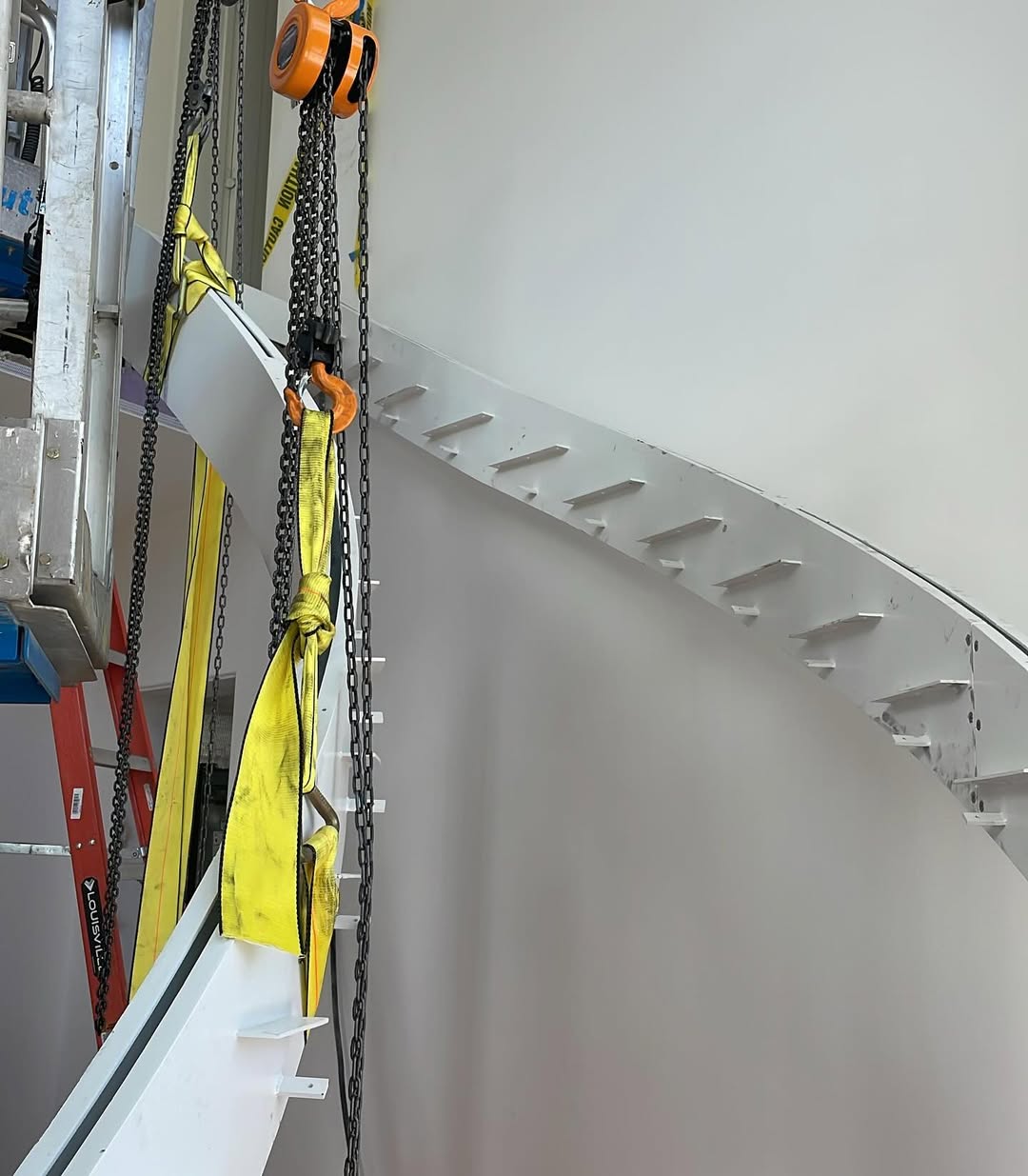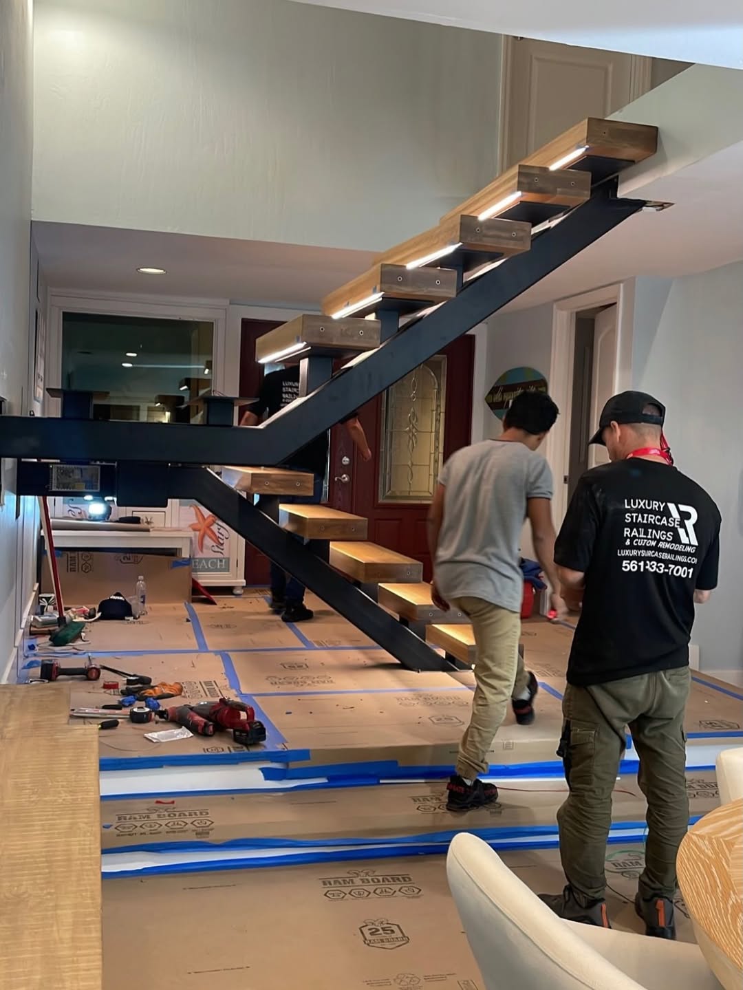 · There is a single central steel beam running along the middle of the staircase.